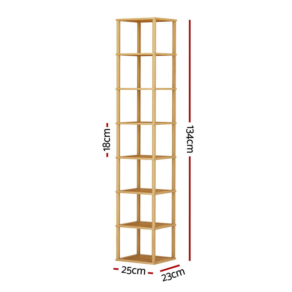 The Artiss Taylor Shoe Rack is crafted from high-quality bamboo and MDF board, ensuring a sturdy build. Each tier has a weight capacity of 5kg and stands 18cm high, with overall dimensions of 25cm x 23cm x 134cm. It comes in a beautiful pine color.