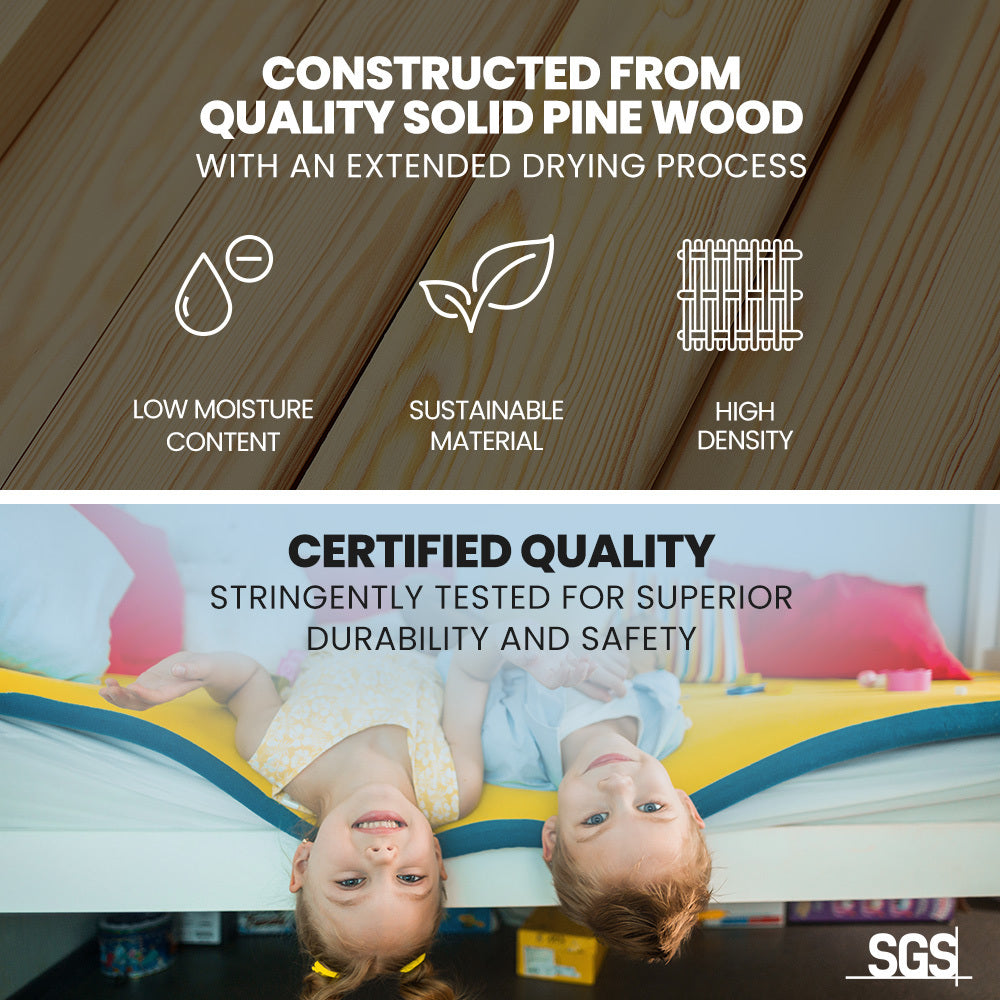 Constructed from sustainably sourced timber, it stands out for its durability and safety, having undergone rigorous SGS certification tests to guarantee superior quality. The Kingston Slumber bunk bed features robust plywood slats and a securely fixed ladder, providing worry-free access to the top bunk. Additionally, the bed includes an exclusive toy shelf, perfect for keeping beloved items organized and within reach. The customizable ladder configuration allows for installation on either the left or right side of the bed, accommodating various room layouts for flexibility.