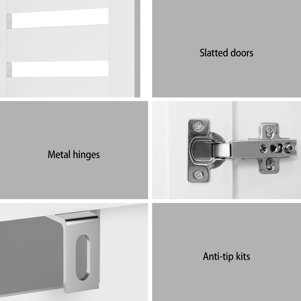 Crafted from engineered wood with a durable melamine surface, the cabinet ensures longevity while maintaining an attractive appearance. It features heavy-duty metal hinges and a wall-mount hardware for secure and stable installation.
