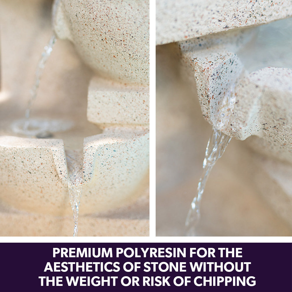 The fountain is constructed from durable, premium polyresin that is both weatherproof and non-corrosive, ensuring longevity and maintaining its beauty over time.