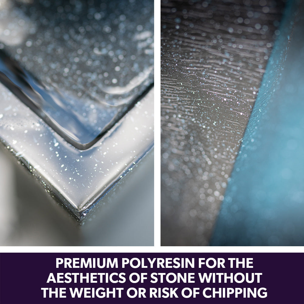 The fountain is crafted from premium Polyresin, mimicking the look and feel of stone while remaining lightweight and resistant to chipping. It features a bold freestanding design, making it an ideal fit for contemporary alfresco spaces.