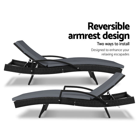 Gardeon 2x Sun Lounge Wicker Lounger Outdoor Furniture Beach Chair Armrest Adjustable Black