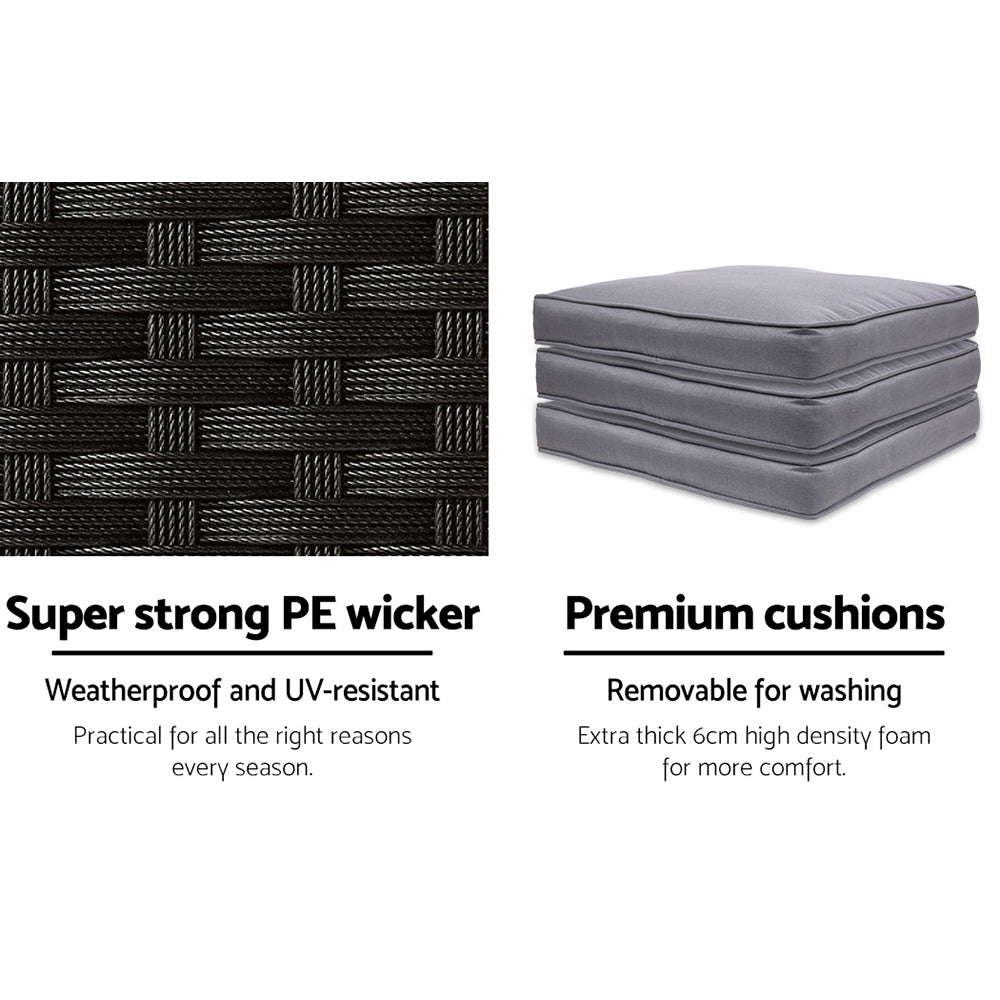 Crafted from powder-coated steel and quality PE wicker, this bar set withstands the elements, from sun to rain, ensuring durability for years. The upgraded chairs feature inclined backrests and extra-comfortable 5cm thick foam cushions, ensuring you can enjoy long conversations without discomfort.