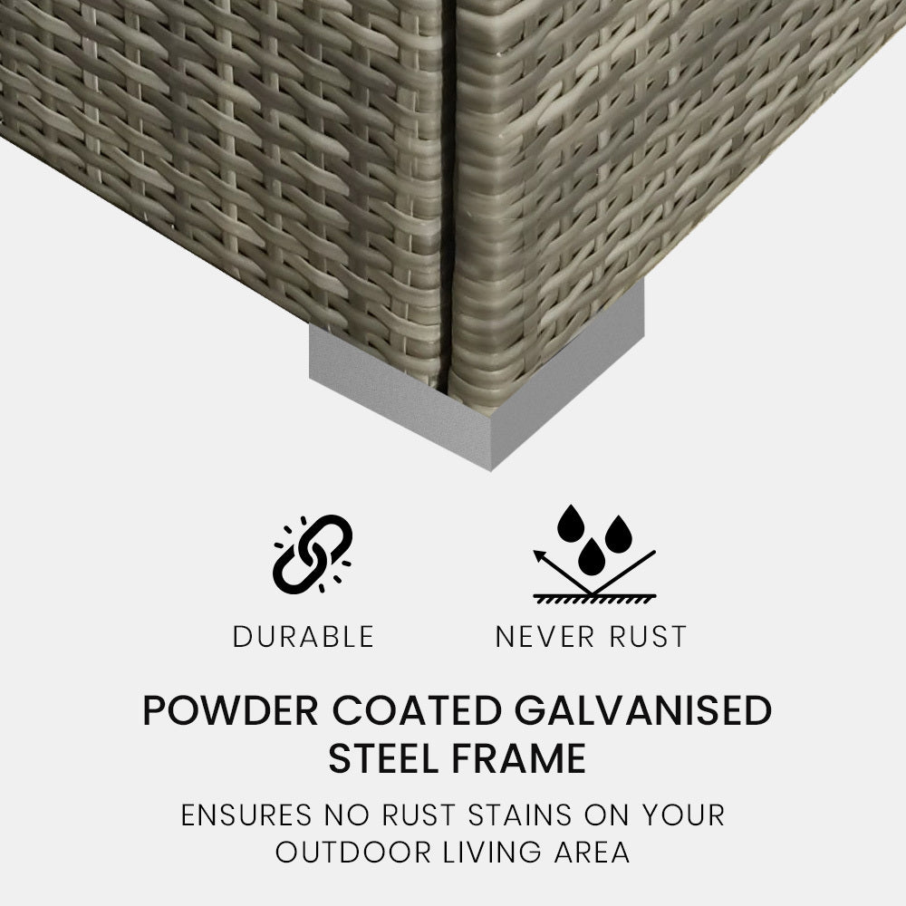 This London Rattan Corner Sofa is a stylish yet affordable outdoor lounge designed to provide utmost comfort. The London Rattan outdoor corner sofa has a durable galvanised steel frame with additional powder coating, ensuring no rust stains on your outdoor living area.